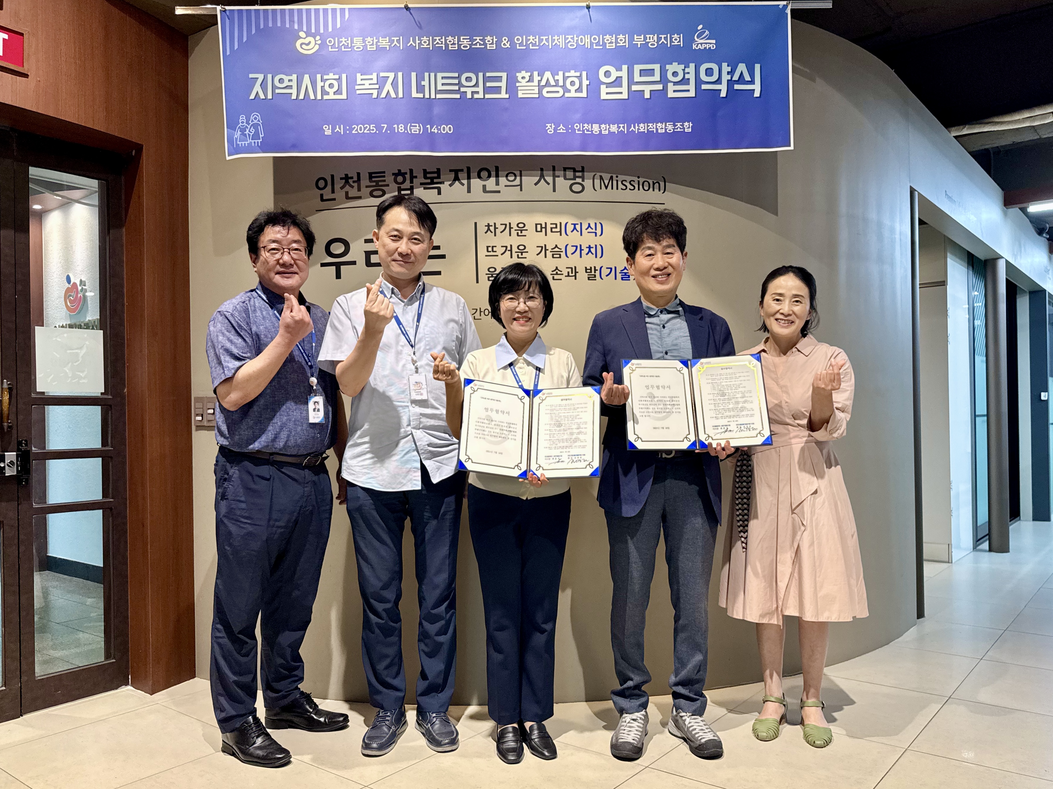 2025년 7월 18일, 인천통합복지 사회적협동조합(이사장 최훈경)과 인천지체장애인협회 부평구지회(회장 전경천)는 지역사회 복지 네트워크 활성화와 장애인의 인권 및 권리 증진을 위한 상호 협력을 목적으로 업무협약을 체결했다.